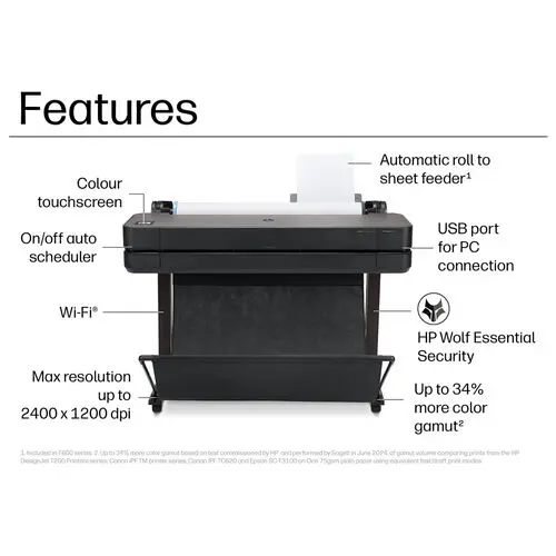 The HP DesignJet T630 A0 Printer 5HB11D is a professional-grade large-format printer designed for architects, engineers, and technical designers. It delivers high-speed, precise printing for A0/E-size projects, combining advanced media handling, excellent colour accuracy, and smart workflow tools in a compact, studio-friendly footprint.