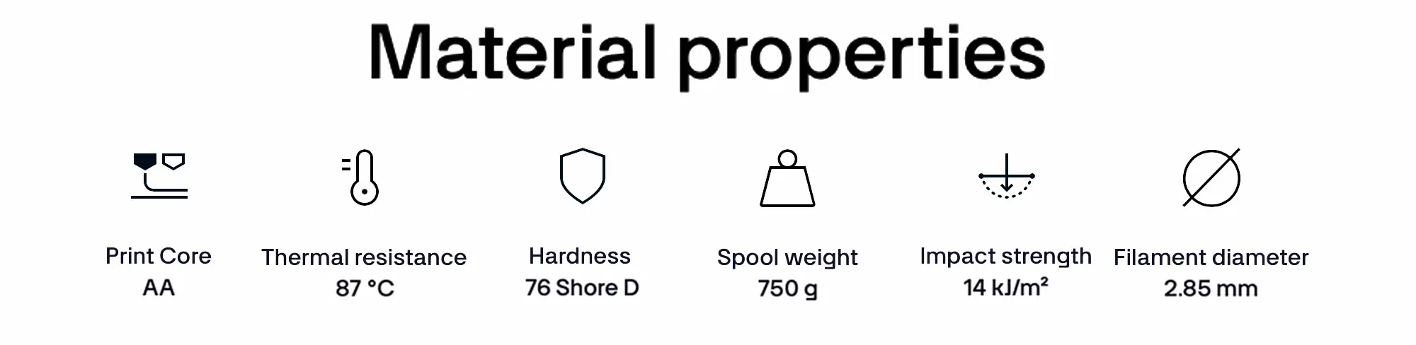 - Not suitable for applications where the printed part is exposed to temperatures over 85°C