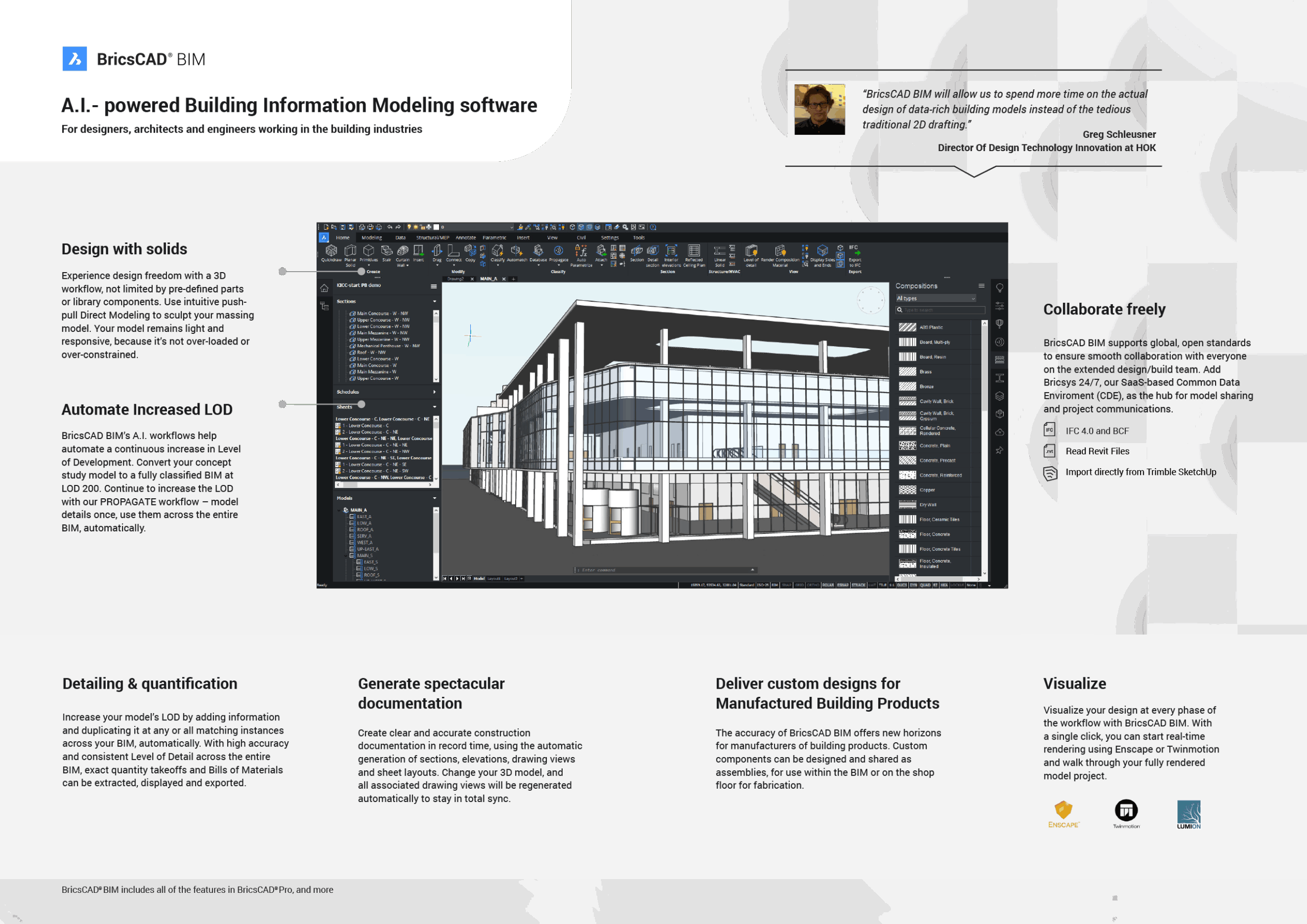 BricsCAD BIM V25 is an advanced building information modelling solution that combines the familiarity of DWG-based CAD workflows with powerful BIM tools. Designed for architects, engineers, and construction professionals, it offers flexible 3D modelling capabilities that transition seamlessly from design to BIM elements, leveraging AI-driven automation to handle tasks such as data management, documentation, and detailing.