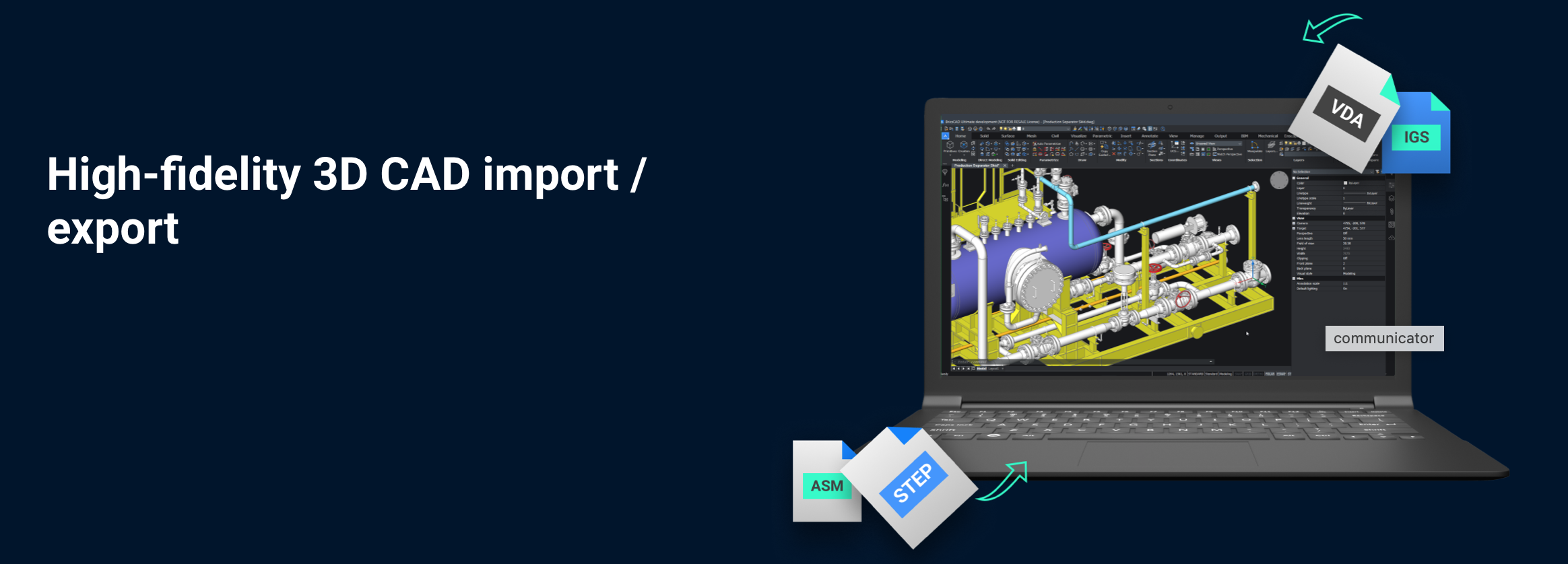 Communicator for BricsCAD® is an optional plugin for Pro and higher license levels of BricsCAD that imports and exports 3D data between major CAD formats. Its high-quality conversions facilitate the re-use of 3D CAD data to improve productivity and reduce project costs.