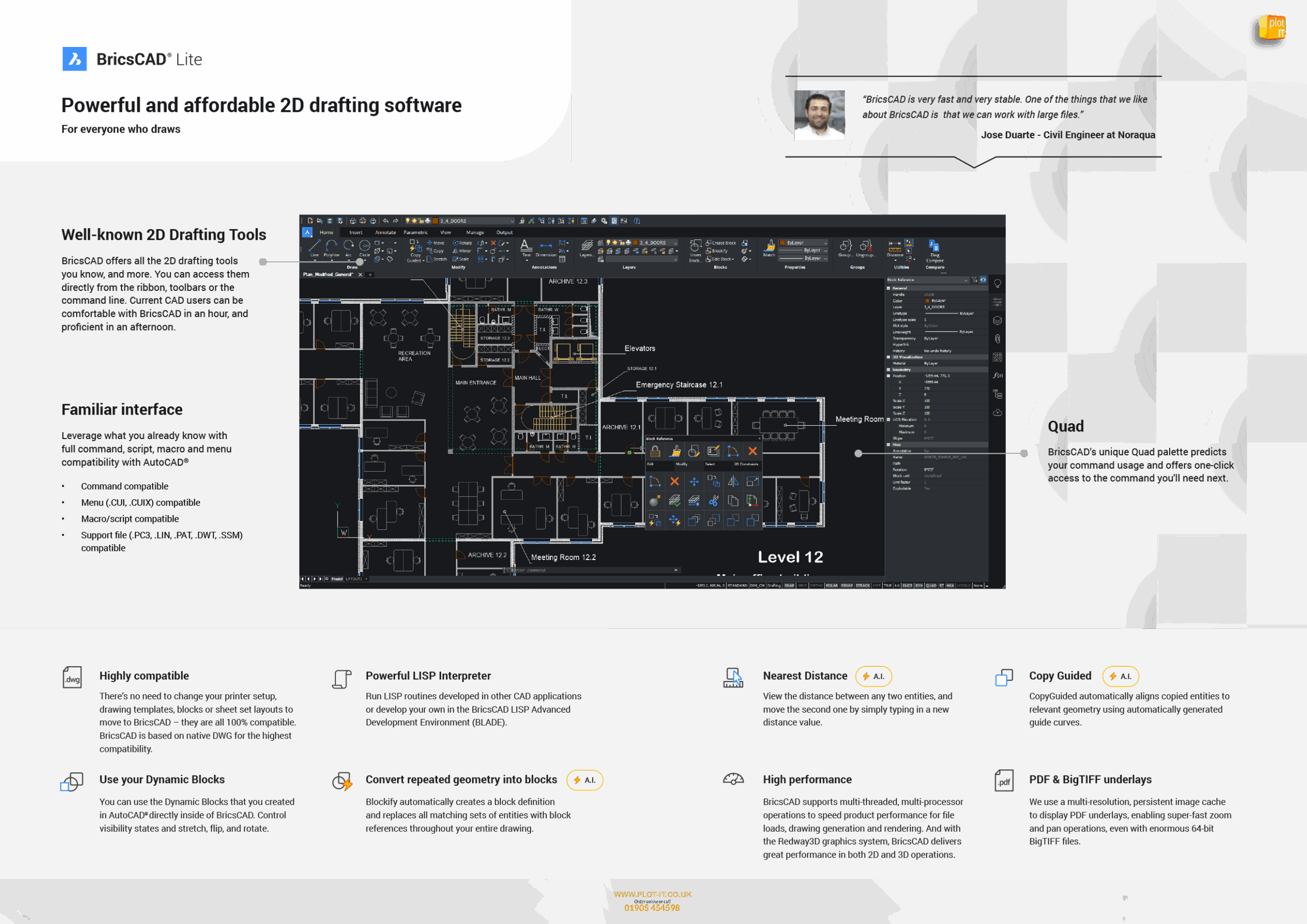 Ideal for professionals in architecture, engineering, and construction, BricsCAD Lite delivers powerful 2D drafting capabilities at an affordable price.