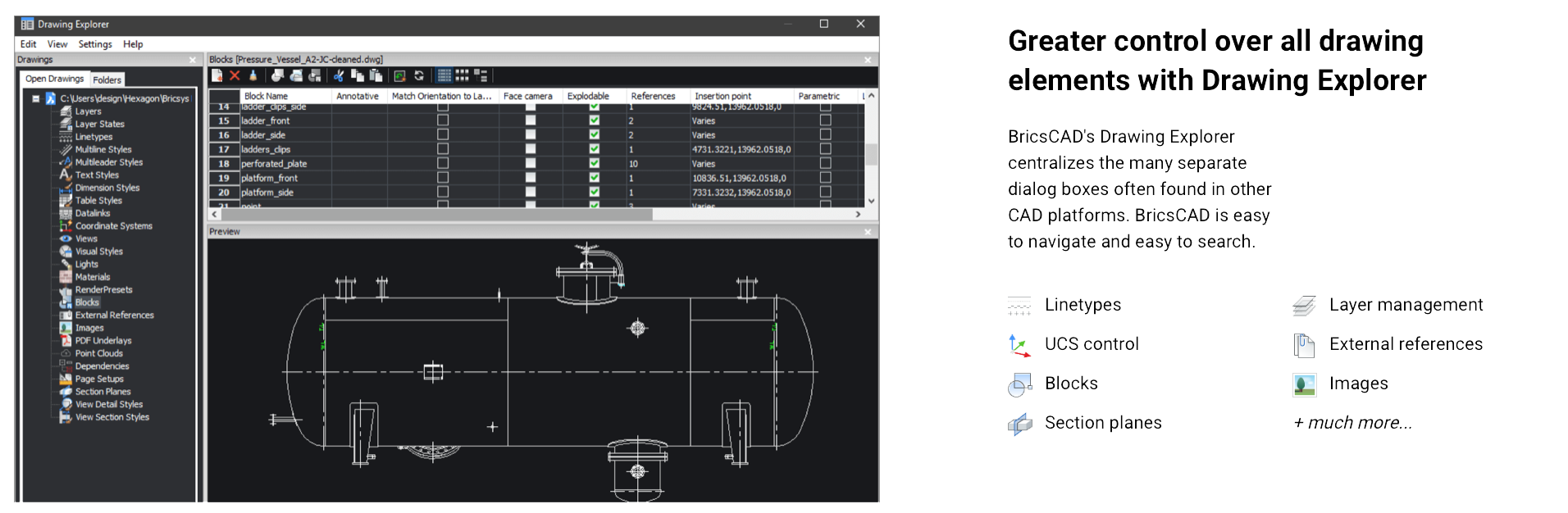 BricsCAD Lite V25 is designed to optimise 2D drafting with enhanced efficiency and compatibility features for AutoCAD users, offering robust support for the DWG format, command compatibility, and familiar tools. Key features include new machine learning-driven commands that improve task automation, such as the BLOCKIFY tool, which identifies repeated geometry and converts it to blocks, reducing file size. The COPYGUIDED function enables precise alignment when copying entities, and the Drawing Explorer centralises drawing management for easier navigation across layers, blocks, and external references.