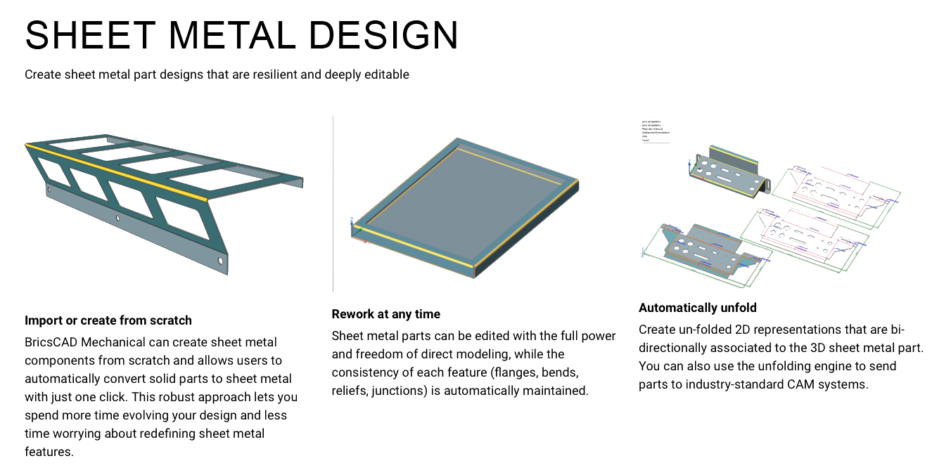 • Tools for creating, editing, and flattening sheet metal parts.