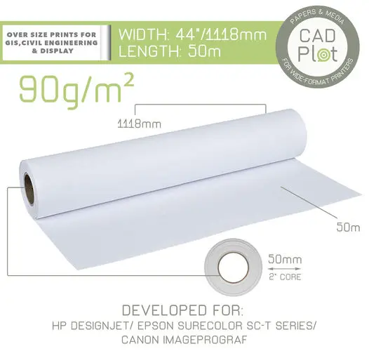 CAD Plot 90 Inkjet Plotter Paper 90gsm 44-inch 1118mm x 50m, an uncoated inkjet plotter paper. The perfect choice for architects, builders, engineers, and designers who demand crisp, clear prints on smooth white paper, without it costing a fortune.