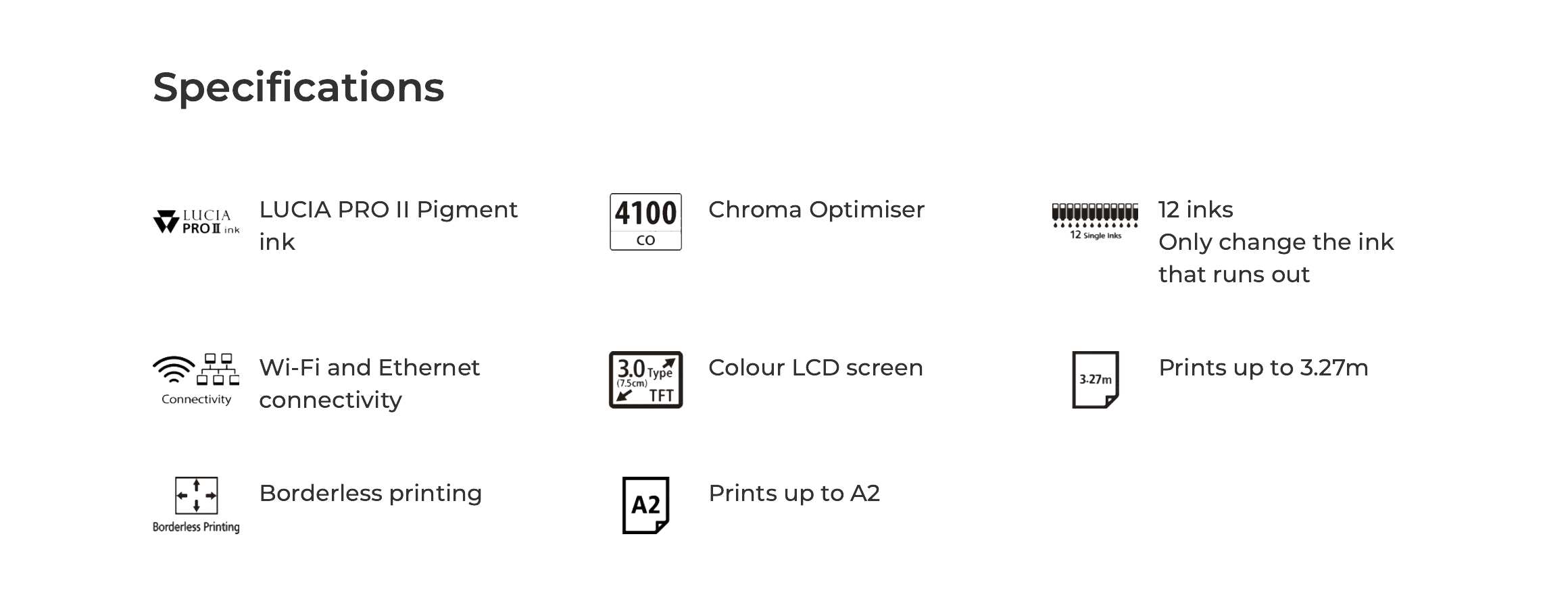 Achieve deeper blacks, richer blues, and smooth colour gradation, thanks to the new 12-colour LUCIA PRO II inks with Chroma Optimiser for smooth reflections and anti-bronzing.