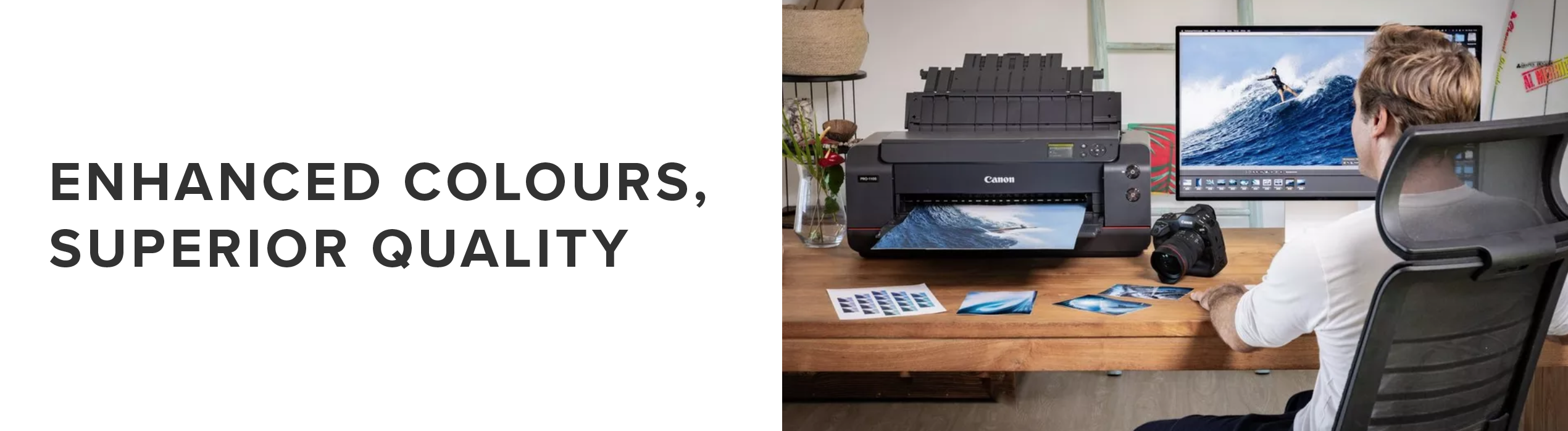 The ImagePrograf Pro-1100 is built for high-output performance, utilising an extensive 11-ink system along with Chroma Optimiser. This is applied over the printed image to smooth out the unevenness between ink droplets, enhancing glossiness, creating a flatter surface, and expanding the colour gamut for richer, more vibrant prints.