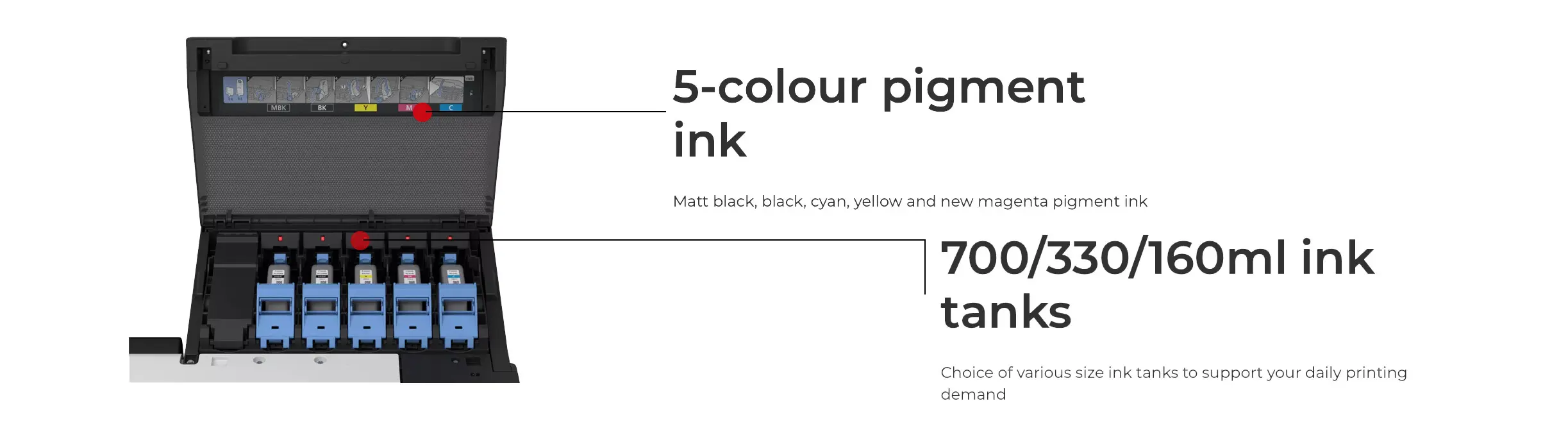 The imagePROGRAF TX series ensures uninterrupted productivity with hot-swap ink tanks, allowing you to replace ink without stopping the print job. A reserve sub-ink system automatically kicks in when needed, so you can use every drop efficiently, minimising downtime and reducing costs. Plus, you can customise your setup with ink tank sizes that suit your workload—choose from 160ml, 330ml, or 700ml options for maximum flexibility.