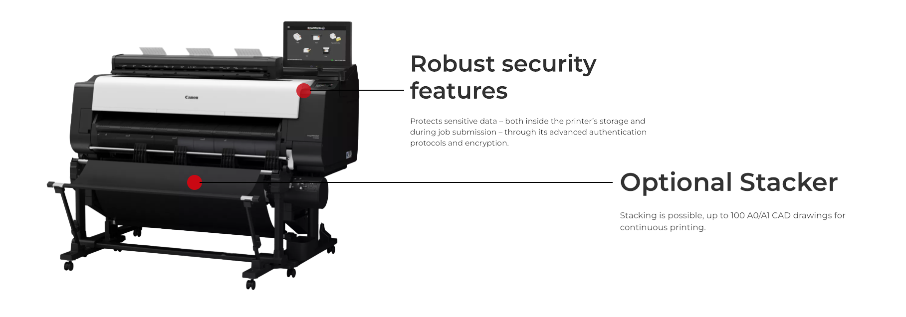 Whether you’re creating intricate architectural plans or complex engineering diagrams, make sure your printing equipment can keep up. The imagePROGRAF TX series offers high-speed performance at 3.3 ppm for A1 sheets, with advanced features like colour calibration, printhead monitoring and automatic ink adjustment to minimise errors. The dual roll option allows for easy switching between media types and sizes, while the optional stacking tray supports continuous output of up to 100 A0/A1 technical drawings, ensuring maximum efficiency.