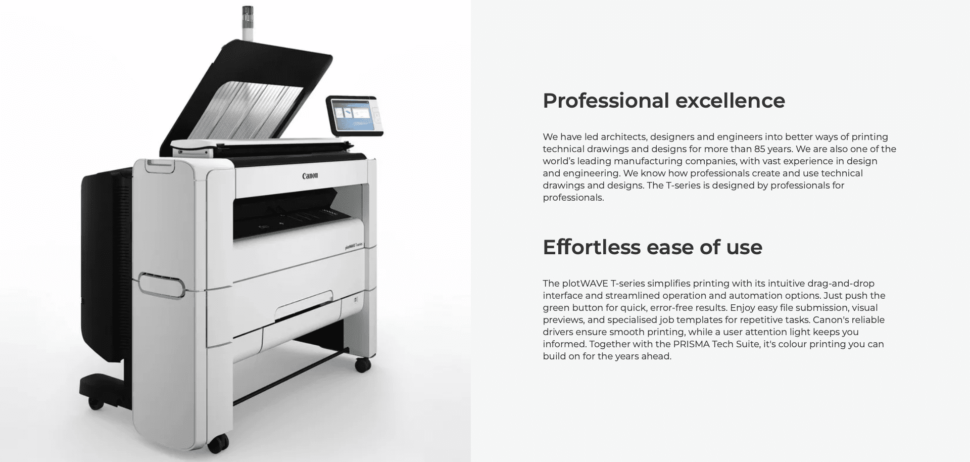 The T-series provides productive ease of use for almost every task, from a quick print to complex jobs and document sets. Together with the PRISMA Tech Suite, it’s a printer you can build on for the years ahead.