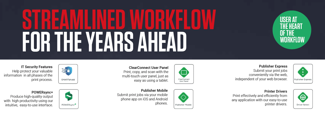 The operation is user-friendly from the moment you start, built on straightforward drag-and-drop functionality. You can upload files directly from your web browser and print from your compatible applications using a simple and intuitive set of drivers.