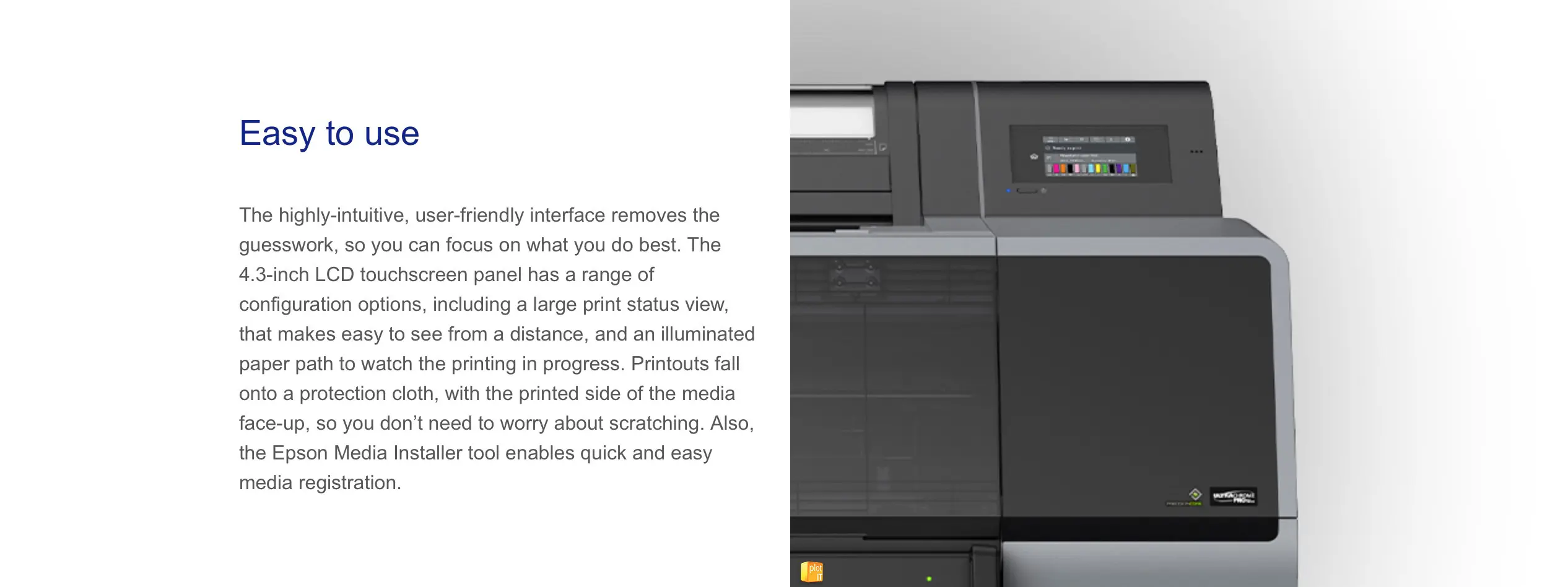 A bright LCD touchscreen offers smooth navigation. Internal lighting helps monitor prints in real time. The large status LED keeps operators updated, even from a distance. Epson also provides a complete ecosystem: printer, inks, substrates, software, and support.