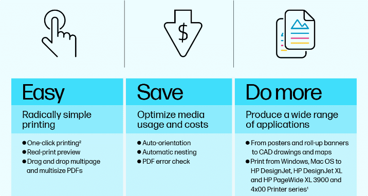 Software: HP Click (easy job submission tool) HP app (remote printing)