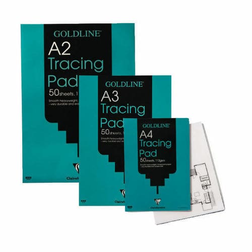 Goldline Heavyweight Tracing Pad. Top value tracing pads ideal for students and general use, can be used with both pen and pencil. Can also be used for overlays for printing instruction. Each pad has 50 sheets of 112g/m² Tracing Paper. Size A3.
