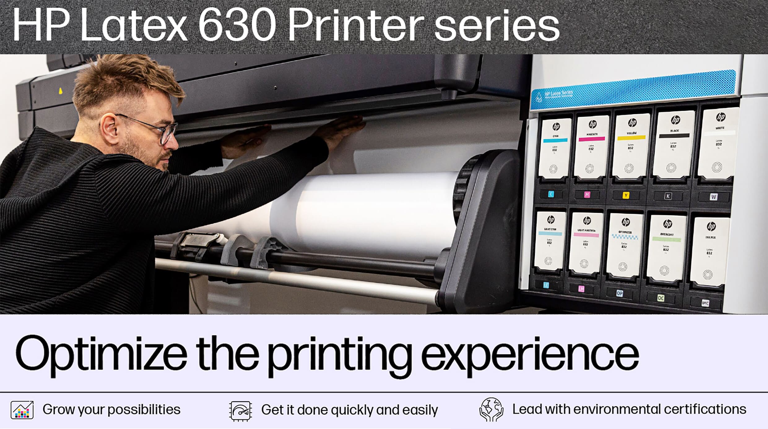 The HP Latex 630 Printer series allows you to deliver stunning, impeccable prints that leave a lasting impression on your clients. Showcasing vibrant colours, seamless gradients and razor-sharp text at a remarkable speed of 14 m²/hr. What's more, your prints are dry from the printer, simplifying finishing and installation processes.