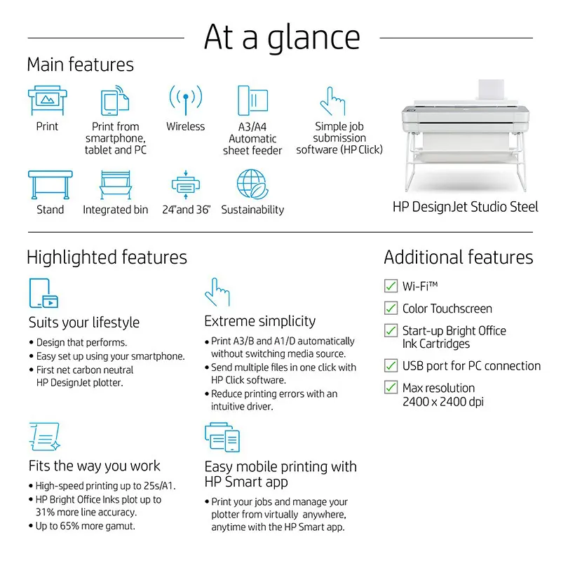 The HP DesignJet Studio plotter series is HP’s most impressive entry-level A1/A0 plotter to date. It combines contemporary design with strong sustainability credentials and is available in a choice of wood or steel finishes. These are the world’s first net carbon-neutral large-format plotters—achieved through sustainable manufacturing, carbon offset programs, and ENERGY STAR® certification.