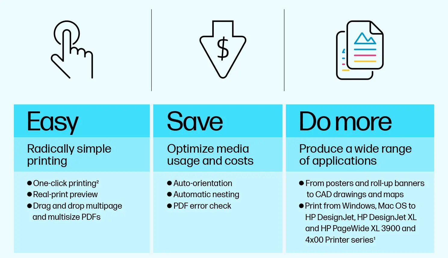 • SOFTWARE: HP Click (easy job submission tool) HP app (remote printing)