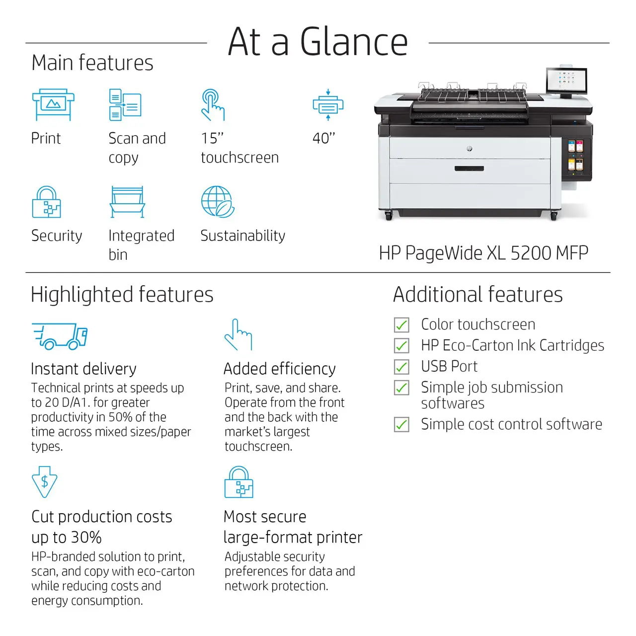 The HP PageWide XL 5200 MFP delivers production-speed wide-format printing with outstanding efficiency and quality. Designed for high-volume environments, it produces up to 20 A1 prints per minute — far faster than comparable toner-based systems — while consuming a fraction of the energy, significantly reducing operating costs.