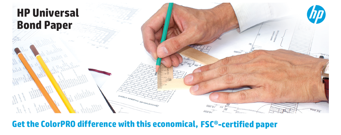 HP Universal Bond Inkjet Plotter Paper 80g/m² produces DIN size A1 and A2 drawings without the need of trimming, featuring HP ColorPRO Technology for better performance from your HP Designjet Printer.