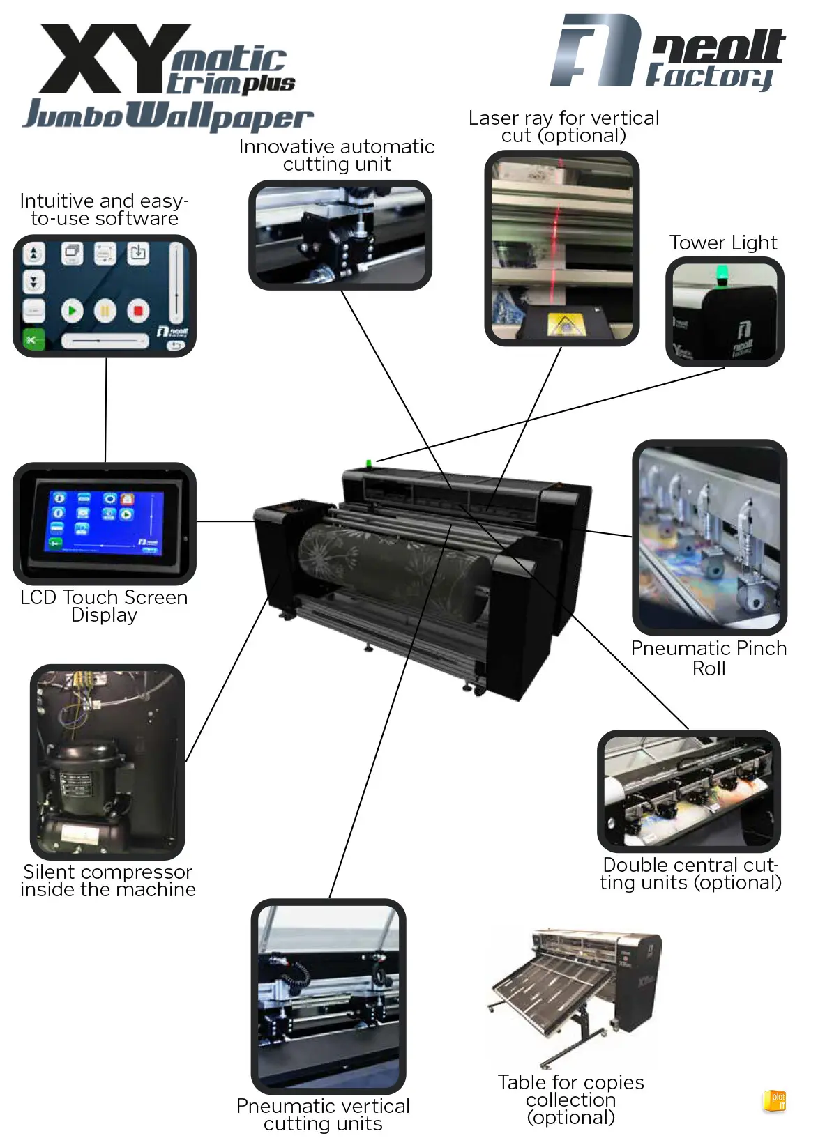 XY Plus Jumbo Wallpaper, is the revolution of industrial wallpaper cutting. The latest invention from the Neolt Factory will allow you to cut jumbo rolls with weights up to 400kg and 500mm in diameter, at a maximum speed of 18 linear meters per minute.