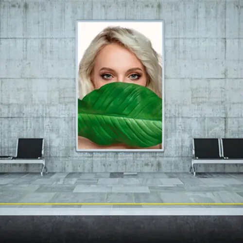 PVC-free, transparent printing material with mirrored layout to create an environmentally friendly laminated composite media for use on shop windows. This media is applied to the inside of shop windows thus elimating potential damage through weather influence or vandalism.