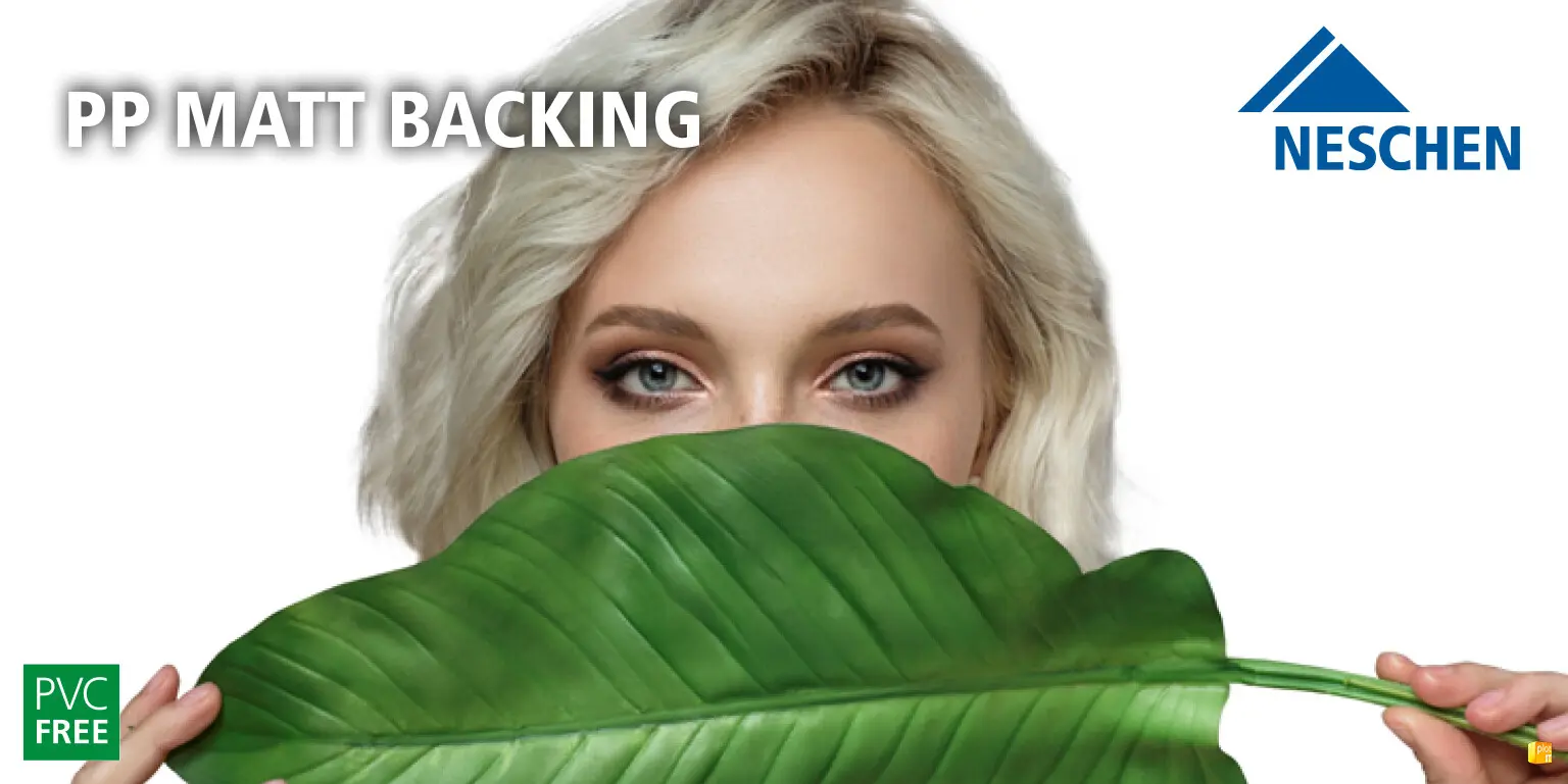 Neschen PP Matt Backing 75µm:  The environmentally friendly alternative to all-over white printing (UV & latex). The white PP matt backing film is made of polypropylene and is specially designed for environmentally friendly composite applications with transparent media. This eliminates the need of a full overprinting with white ink (UV or latex). PP matt backing thus reduces production time and costs (up to 50%).