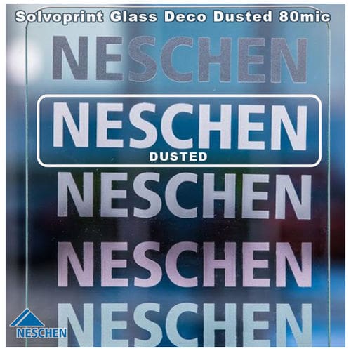 Neschen Solvoprint Glass Deco Dusted 80mic: This 80mic polymeric soft-PVC film has a translucent, milk glass white effect that is easy to apply and a great choice for creative window decorations. Suitable for use with Eco-solvent, Latex and UVC inks this product has an environmentally friendly, permanent water-based adhesive.