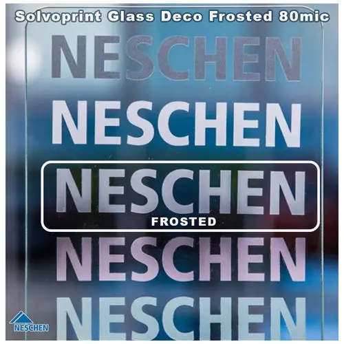 Neschen Solvoprint Glass Deco Frosted 80mic: This 80mic polymeric soft-PVC film has a translucent, light silver finish with a sandblast effect that is easy to apply and a great choice for creative window decorations. Suitable for use with Eco-solvent, Latex and UVC inks this product has an environmentally friendly, permanent water-based adhesive.