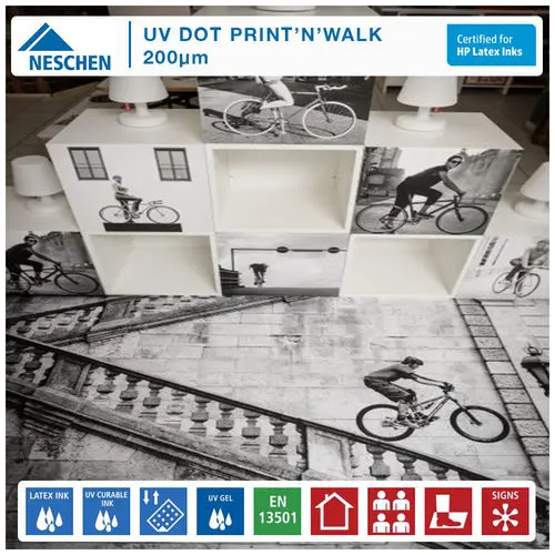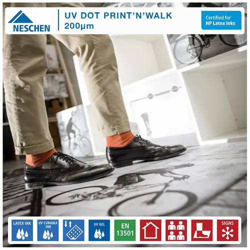 Neschen UV Dot Print'n'Walk Floor Graphics Film 200µm is R9-certified and meets the requirements for slip-resistance in public places. The special film can be printed with UV-curing and HP latex inks in photorealistic quality. The material is flame-resistant even when printed and meets the fire protection requirements according to EN 13501-1.