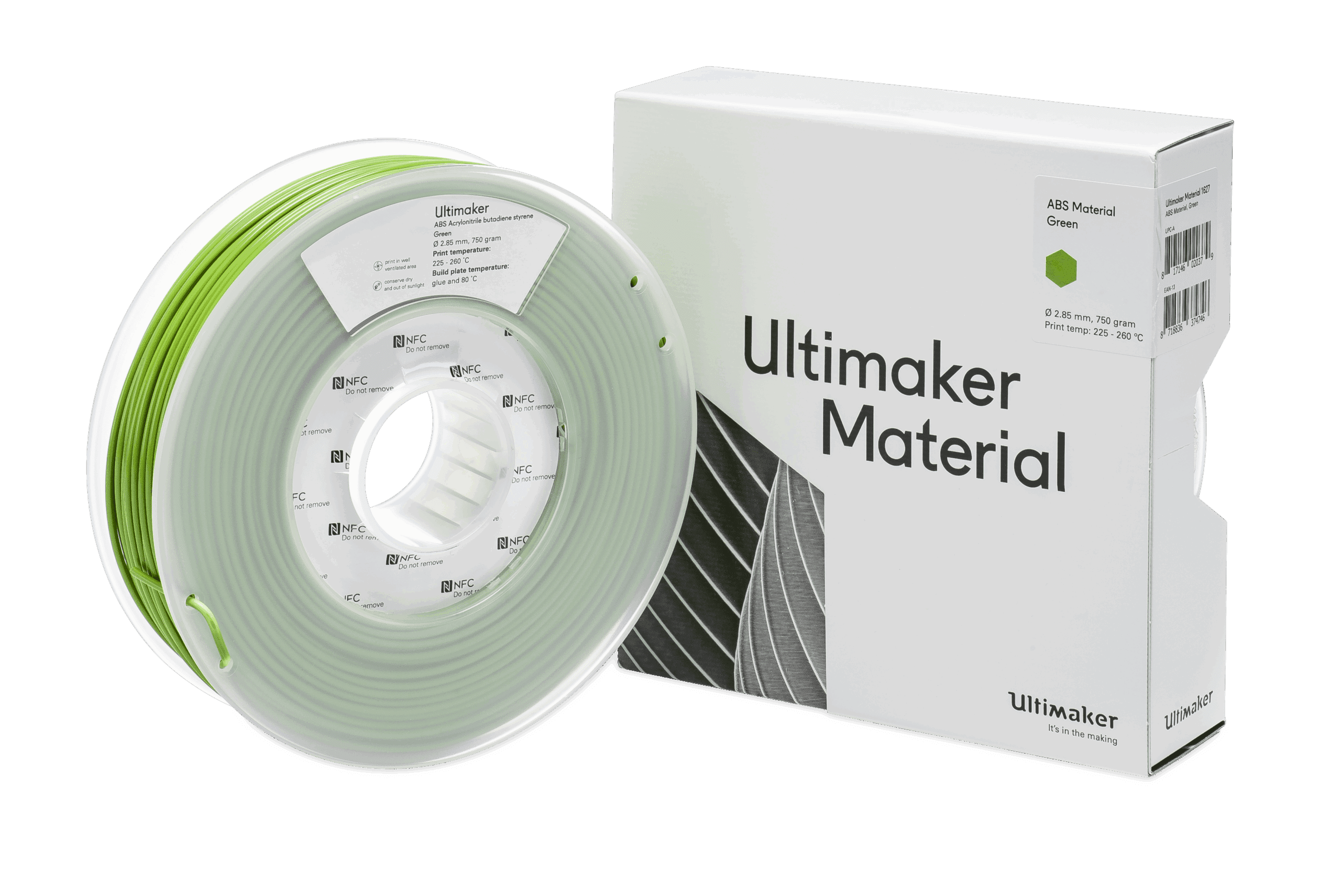 UltiMaker ABS Green 750g Filament (1627): Used by an array of industries worldwide, ABS is known for its exceptional mechanical properties. Ultimaker ABS is specifically formulated to minimise warping and ensure consistent interlayer adhesion. This product is approximately 90m long.