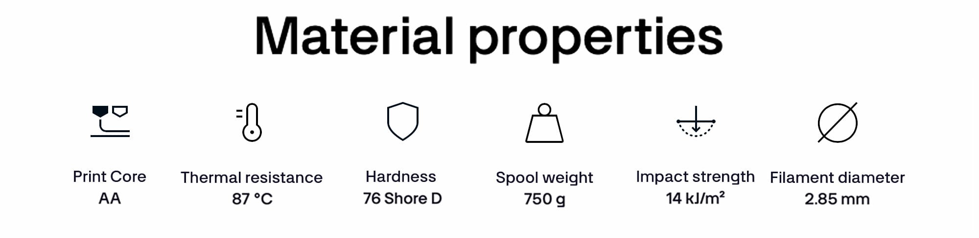 - Not suitable for applications where the printed part is exposed to temperatures over 85°C