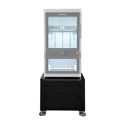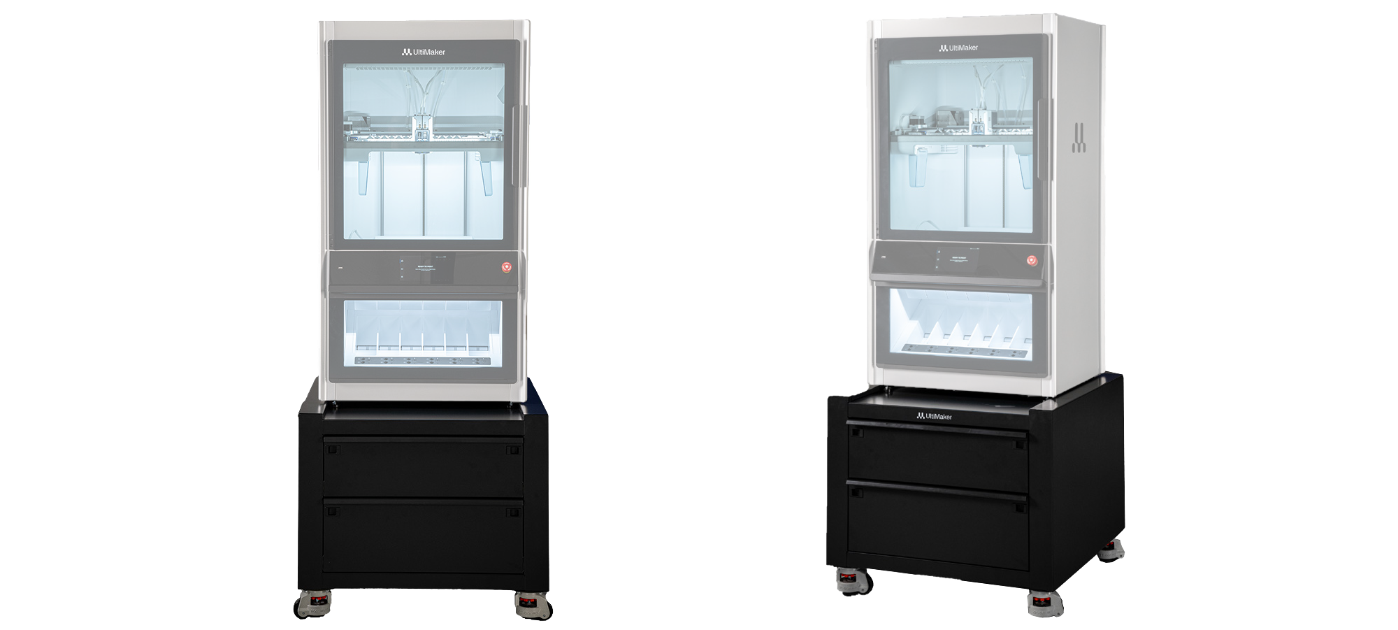 This printer cabinet boasts easy and safe access to the rear side for hassle-free maintenance and repair, ensuring smooth operations without any disruption. Designed specifically for the UltiMaker Factor 4 it offers use of minimal floor space while providing maximum stability with its anti-tilting architecture. Equipped with lock-in mechanisms the printer securely attaches to the cabinet ensuring stability during operation. Additionally, the cabinet’s ergonomic design allows for comfortable operation at the right height, while lockable drawers provide ample space to store up to 18 spools and accessories, keeping everything organised and secure.