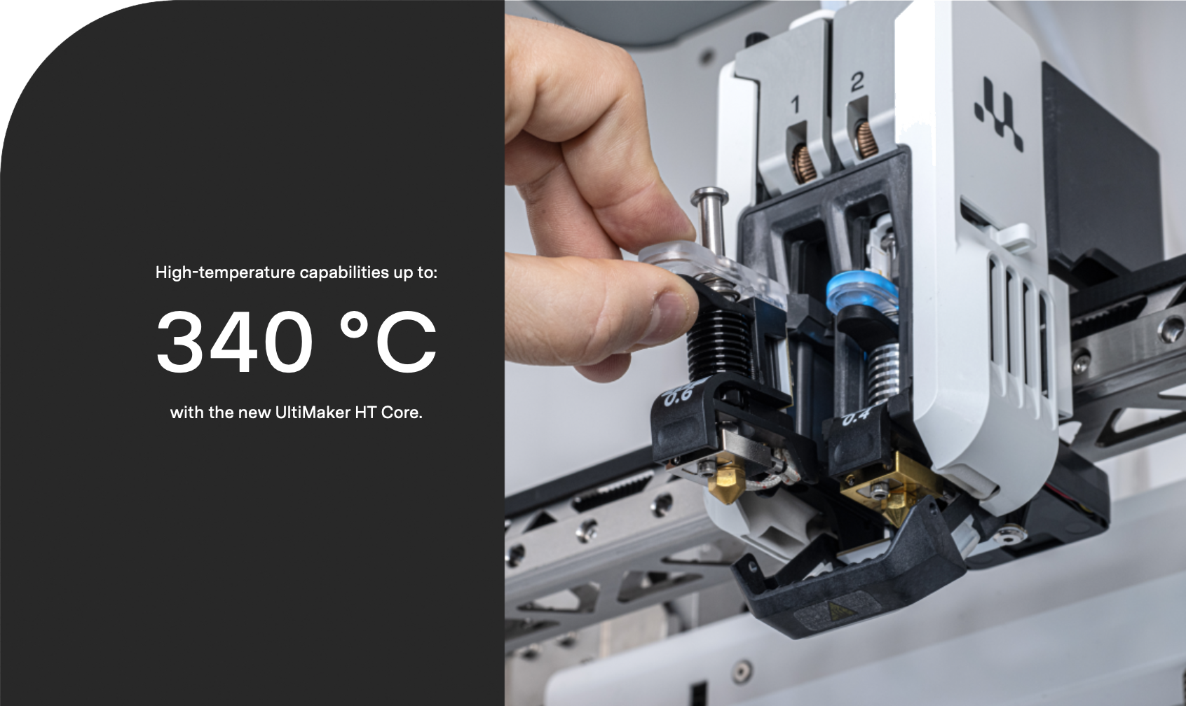 UltiMaker Factor 4 elevates temperatures to 340°C utilizing the HT print core, enabling the printing of high-temperature resistant and durable materials with enhanced confidence.