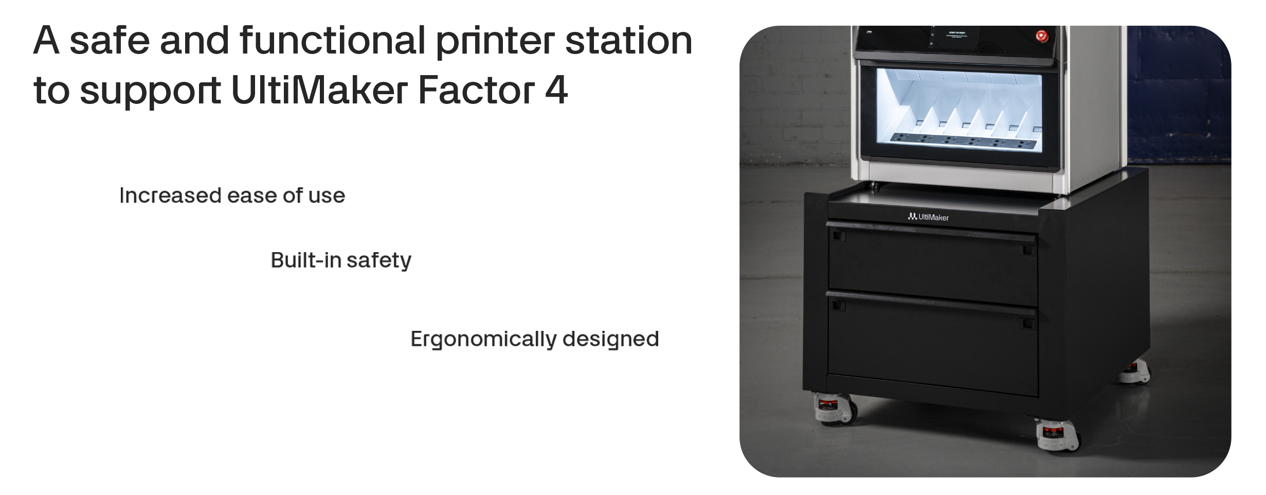 UltiMaker Factor 4 Printer Station Bundle (91C-234991): This bundle includes the UltiMaker Factor 4 3D Printer and Factor 4 Printer Station. Provides a complete industrial application solution, designed specifically for the seamless development, production and confident deployment of essential tools and machine components. When operational continuity is paramount, Factor 4 streamlines factory processes and minimizes human-related inconsistencies. Its advanced features include dual material extrusion, support for engineering materials, and real-time print process reporting, ensuring unparalleled predictability and consistency.