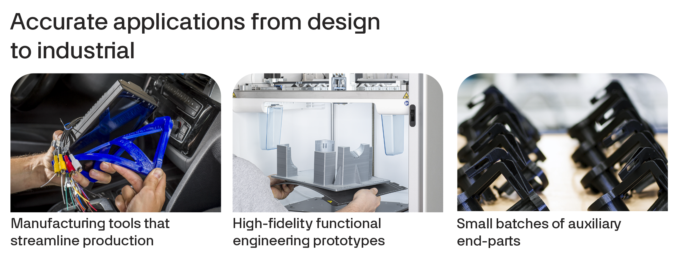 - Dimensional accuracy within ±0.2 mm or ±0.2% of the nominal length across the entire printer build volume, employing materials such as PPS CF, PET CF, Tough PLA, and PETG. This ensures precise and reliable printing results, meeting the most demanding standards.