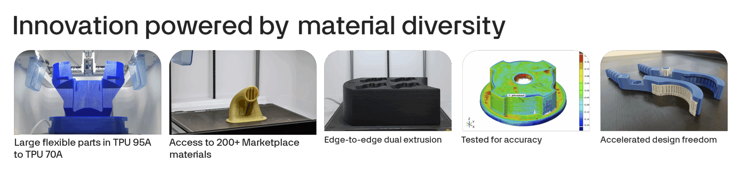 Factor 4 demonstrates exceptional versatility by seamlessly transitioning from 3D printing highly flexible materials to robust composites like the innovative UltiMaker PPS-CF. Thanks to its H-bridge gantry and direct drive head, it facilitates rapid dual-material printing. With an impressive high-temperature range of up to 350°C and a heated bed, it ensures consistent quality even with challenging materials. Moreover, its seamless integration with Cura and major AM software platforms enhances workflow efficiency and compatibility.