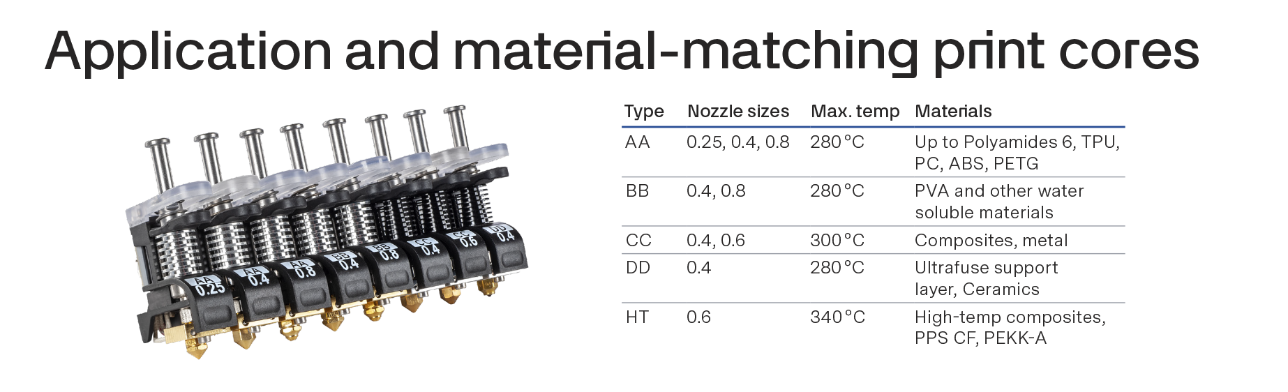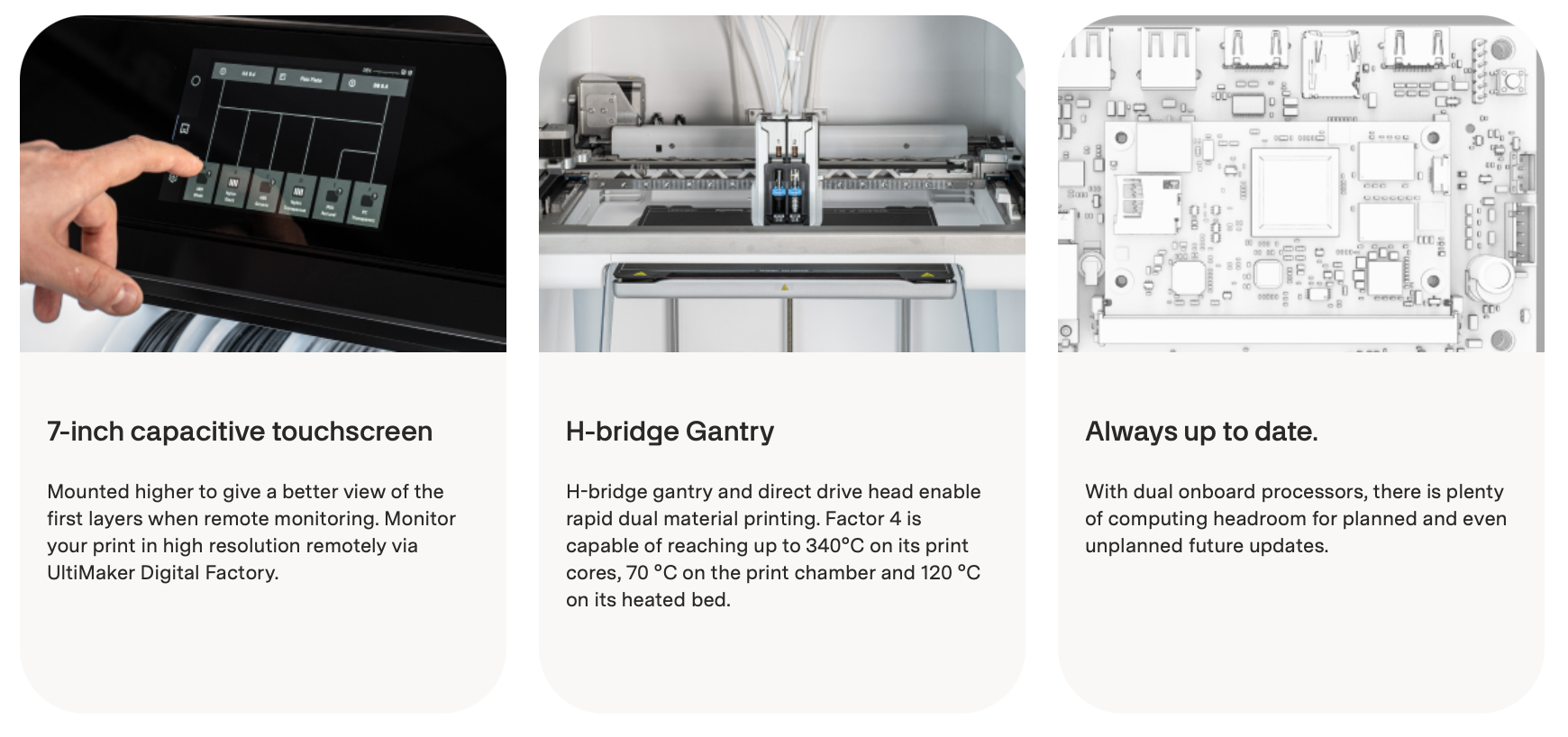 UltiMaker Factor 4 elevates temperatures to 340°C utilizing the HT print core, enabling the printing of high-temperature resistant and durable materials with enhanced confidence.
