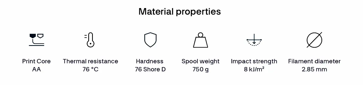 Compared to PLA and Tough PLA, Ultimaker PETG unlocks the widest range of technical applications, offering the printability of PLA, but with the industrial properties you need. This enables you to create a wide range of industrial parts, tools, and prototypes. Ultimaker PETG offers the ideal balance of properties for Ultimaker users in industrial environments, with good all-around visual, functional, and mechanical properties that can withstand environmental influences such as wear, chemicals, and warmer temperatures