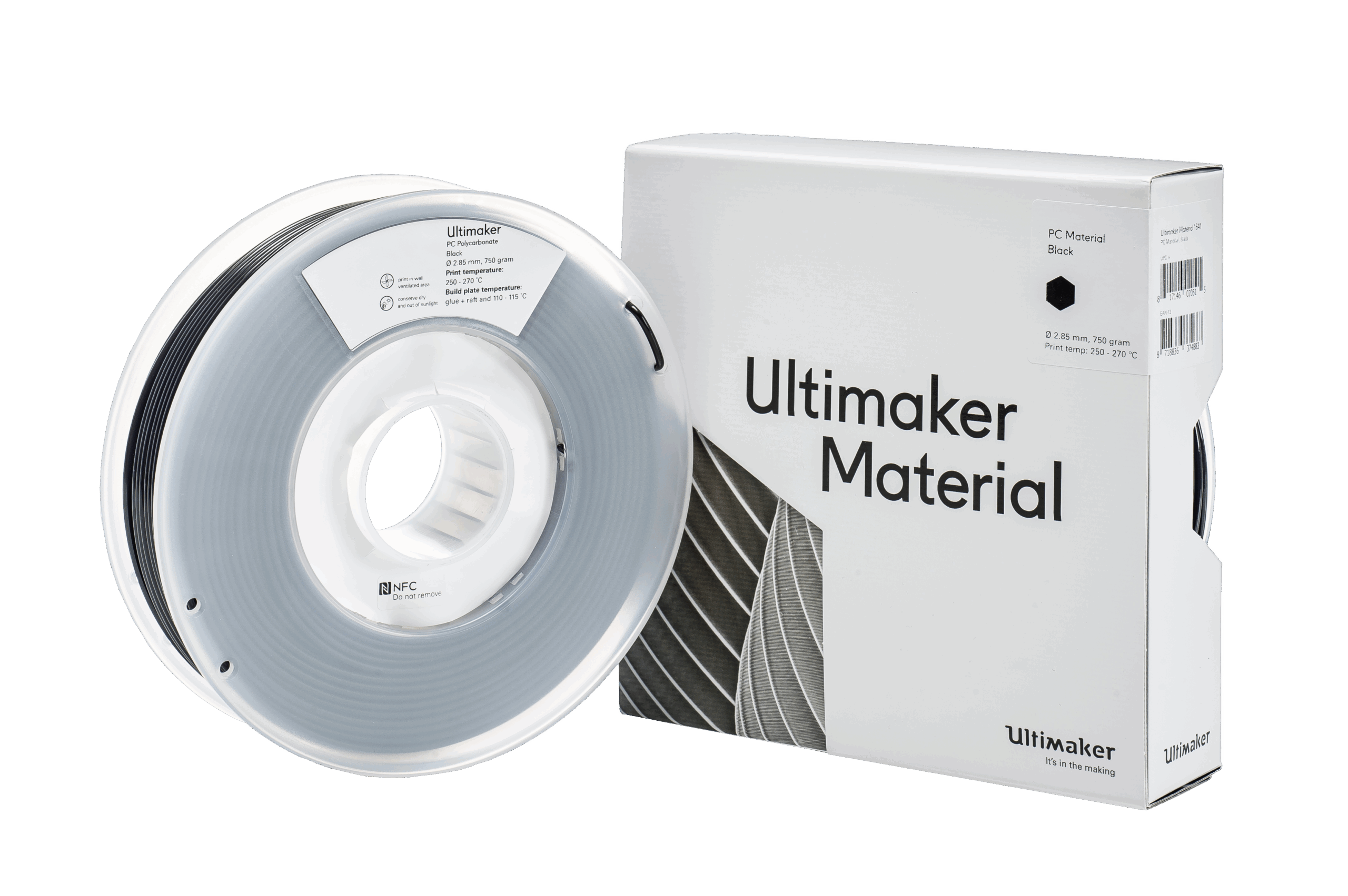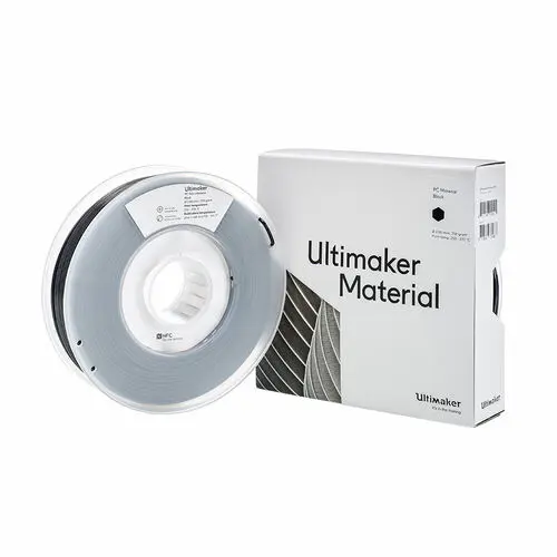 UltiMaker S-Series PC Black 750g Filament (1641): PC can be used for various engineering applications. It is one of the toughest print materials, making it a perfect choice for printing strong objects. PC has a high mechanical strength, good UV stability, and high thermal resistance. It retains its form at temperatures up to 110 °C. In addition, PC has a good dimensional stability and has flame-retardant characteristics. These properties make it suitable for lighting, molds, engineering parts, tools, functional prototyping, and short-run manufacturing.
