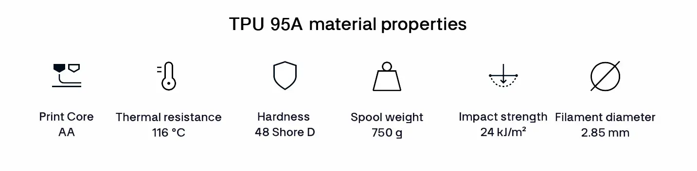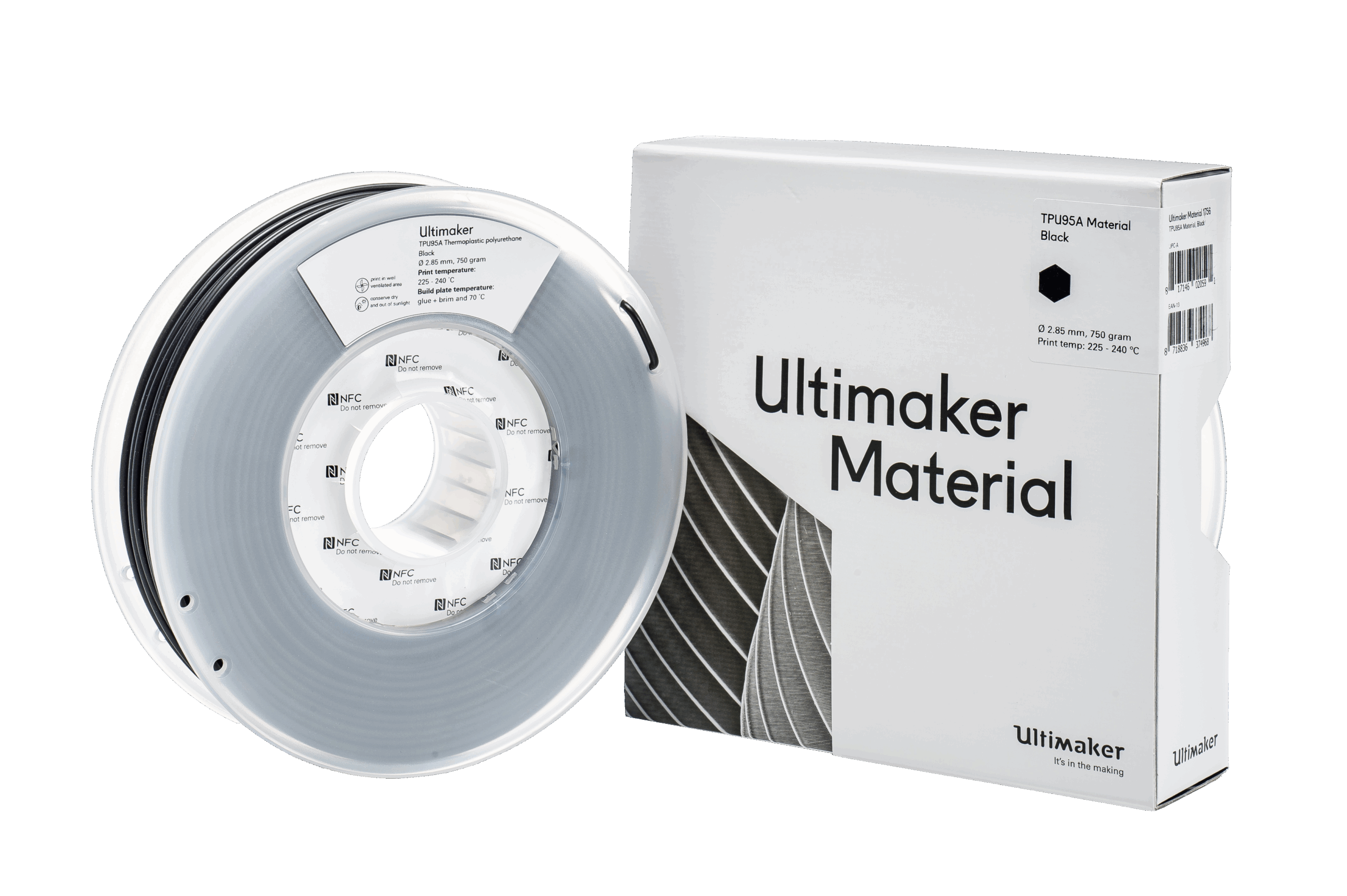 UltiMaker S-Series TPU 95A Black 700g Filament (236592): UltiMaker TPU 95A (thermoplastic polyurethane) is a flexible material, making it ideal for applications that demand chemical resistance and the qualities of rubber and plastic. For a seamless 3D printing experience, we’ve engineered UltiMaker TPU 95A to be easier and faster to print than other TPU filaments on the market. This product is approximately 90m long.