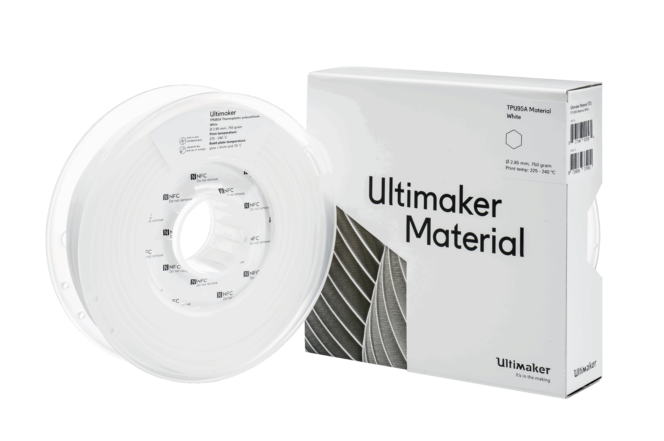UltiMaker S-Series TPU 95A White 700g Filament (236591): UltiMaker TPU 95A (thermoplastic polyurethane) is a flexible material, making it ideal for applications that demand chemical resistance and the qualities of rubber and plastic. For a seamless 3D printing experience, we’ve engineered UltiMaker TPU 95A to be easier and faster to print than other TPU filaments on the market. This product is approximately 90m long.