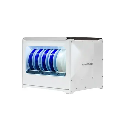 The Ultimaker S5/S7/S8 Material Station Material Station stands as an advanced humidity-controlled chamber designed to accommodate six material spools, allowing flexible loading of up to 4.5kg of material in any order. Boasting cutting-edge features, each bay within the station incorporates automatic material switching, composite-ready feeder wheels, and filament flow sensors.