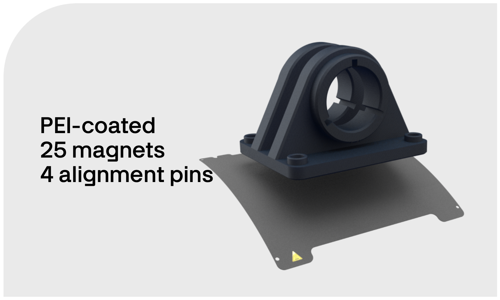 Skip using glue and remove parts effortlessly with the PEI-coated flexible build plate. Its patent-pending design uses 25 magnets and 4 pins for perfect alignment – reducing the time spent using the S7 and increasing productivity.