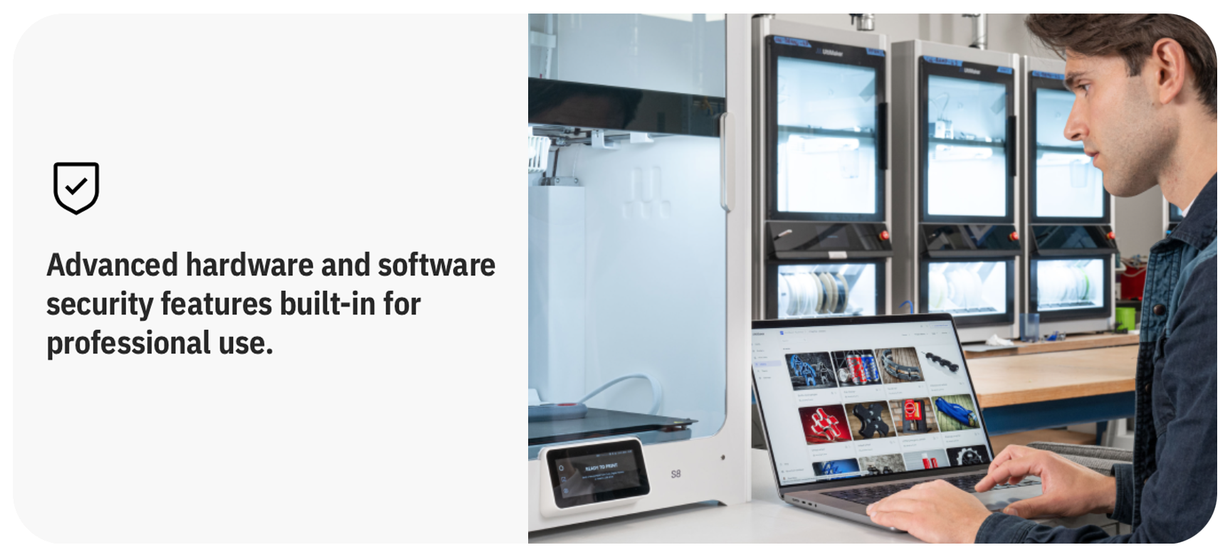 Built with future-proofing in mind, the S8 features a completely revamped electronics platform, offering five times the processing power of its predecessor. This significant upgrade ensures the printer can handle the demands of the advanced motion planner and supports future updates, securing long-term productivity. The robust design and enhanced processing capabilities make the S8 a reliable choice for businesses looking to invest in durable and efficient 3D printing technology.