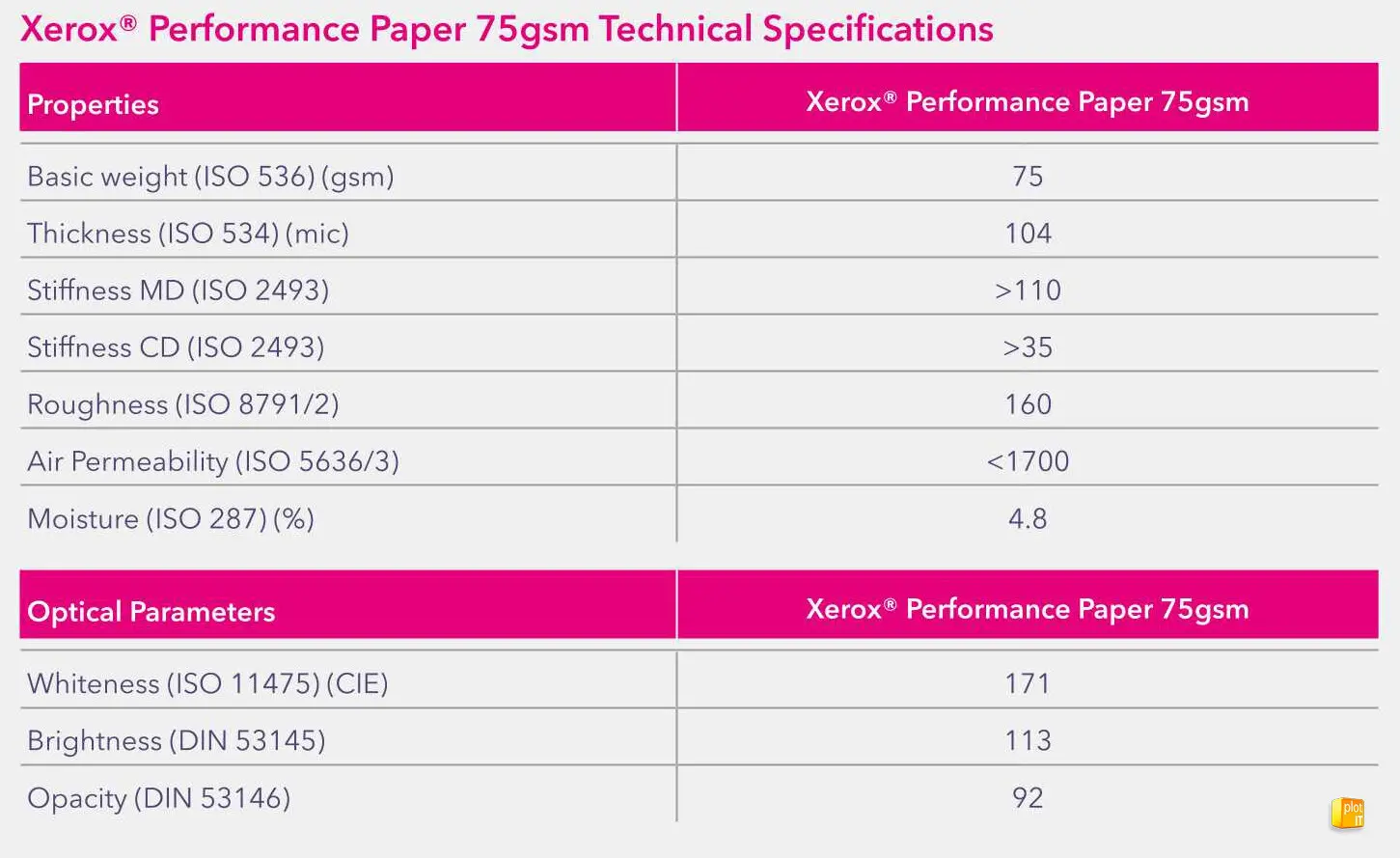 Xerox Performance Plan Copier Paper (FSC) 75g/m²: High quality plain matt paper designed for plan printing. Good whiteness, body and formation. Compatible with all toner based large format printers including Xerox®, Canon, KIP and Ricoh. Improved whiteness and bulk. Consistently smooth to generate sharp and accurate lines. This product is also FSC® certified.